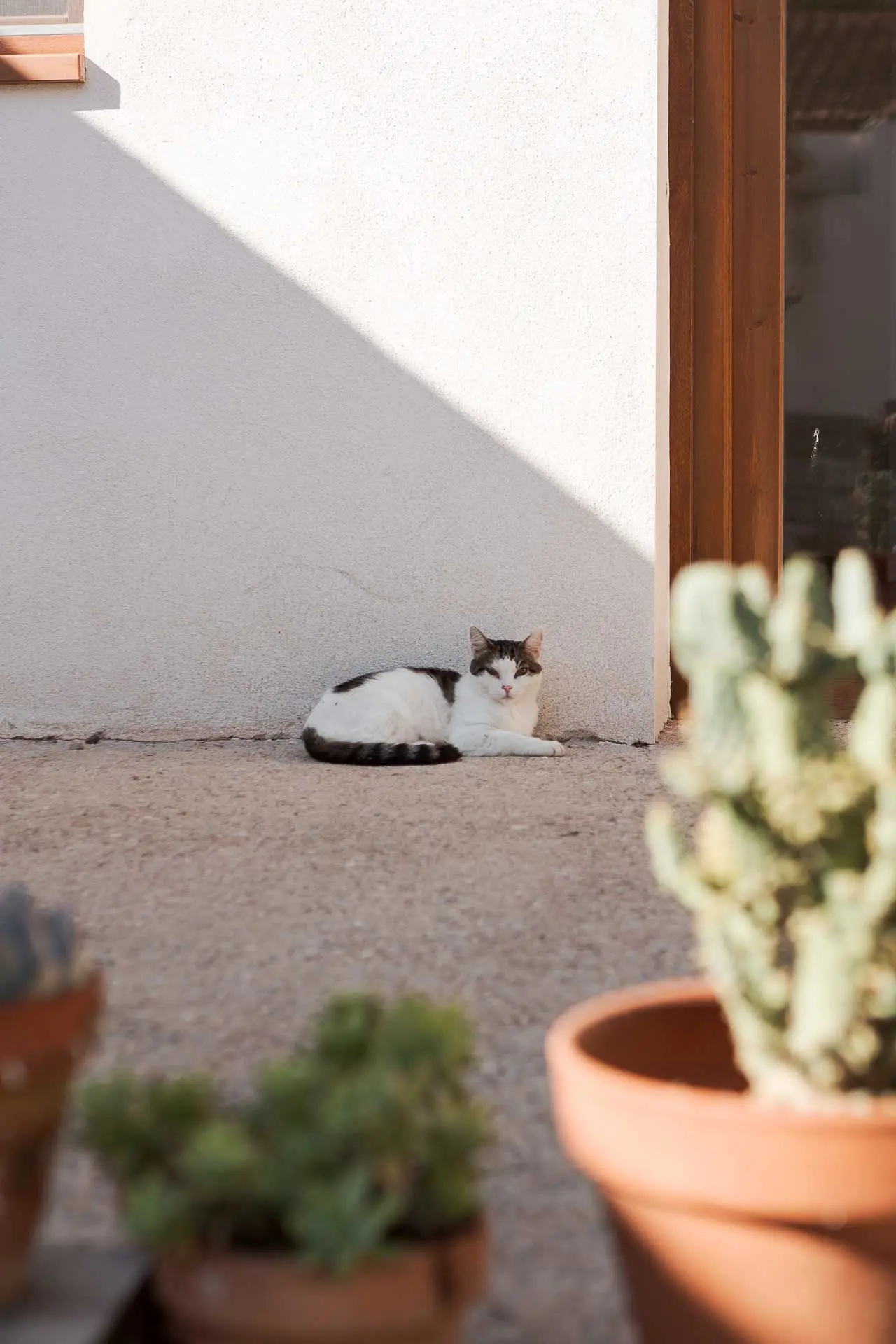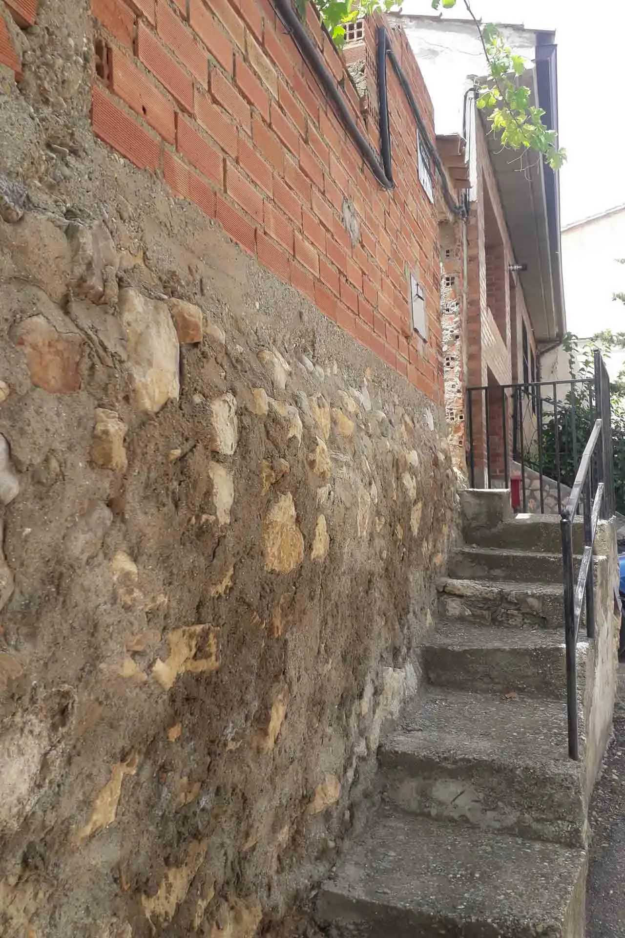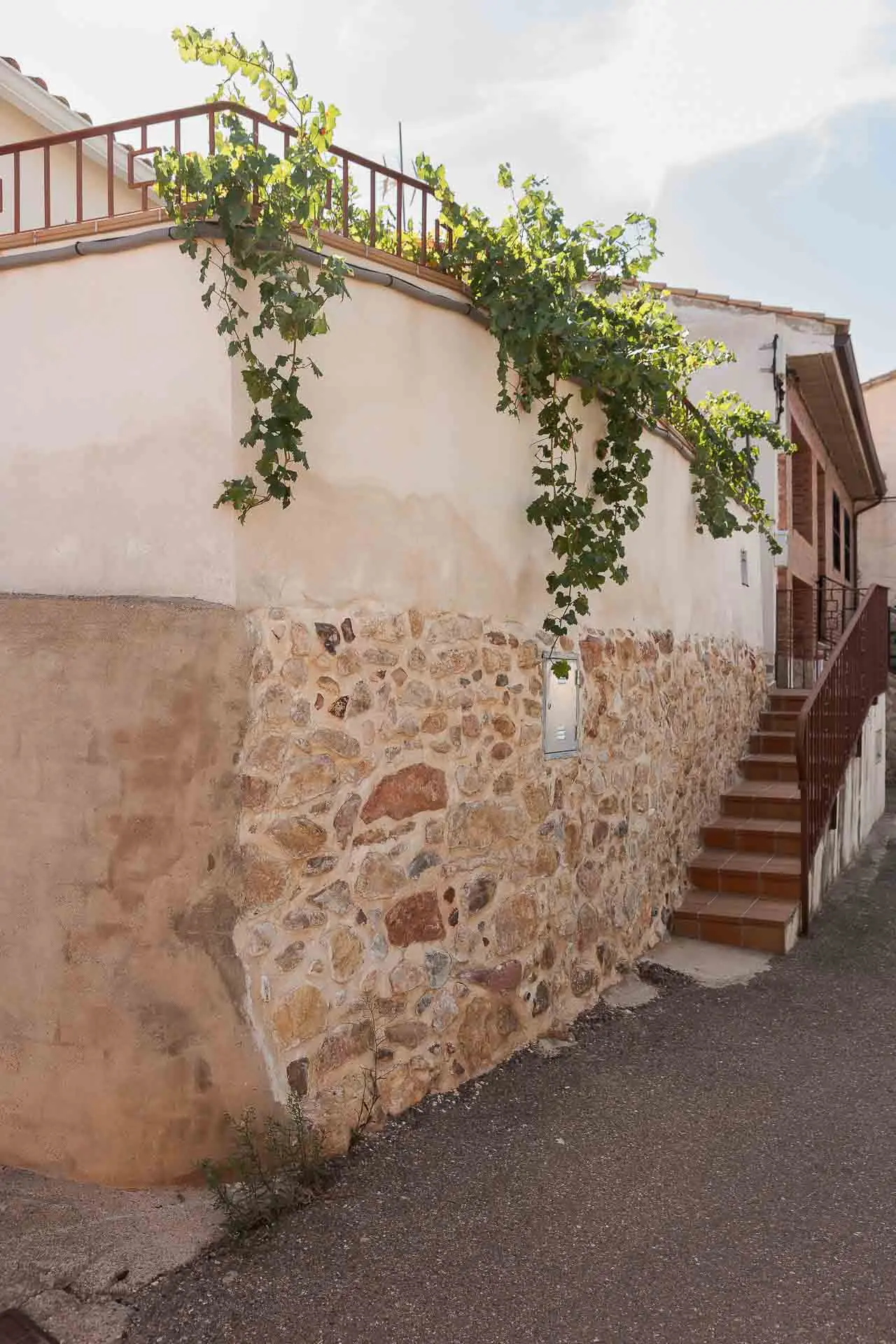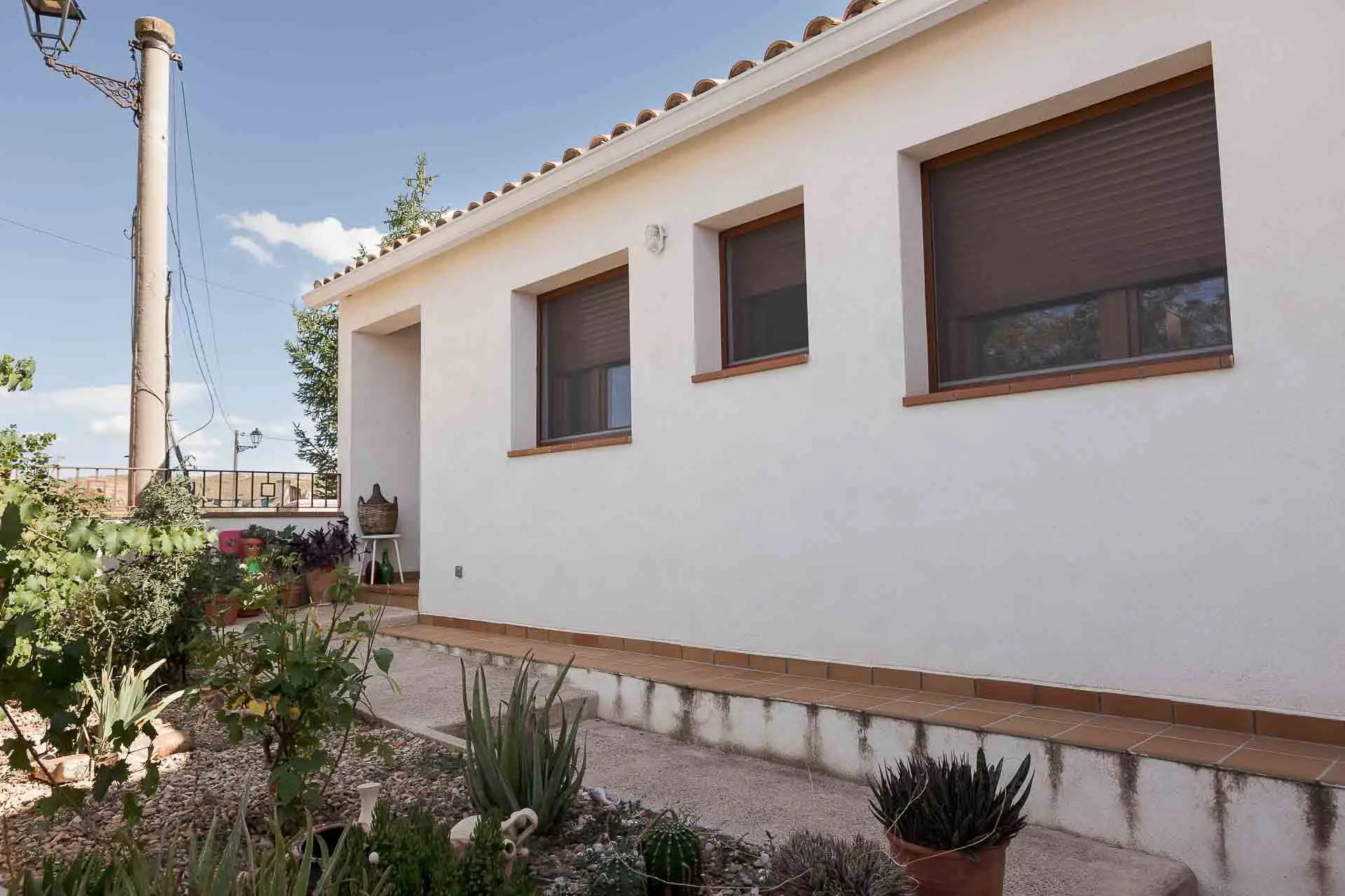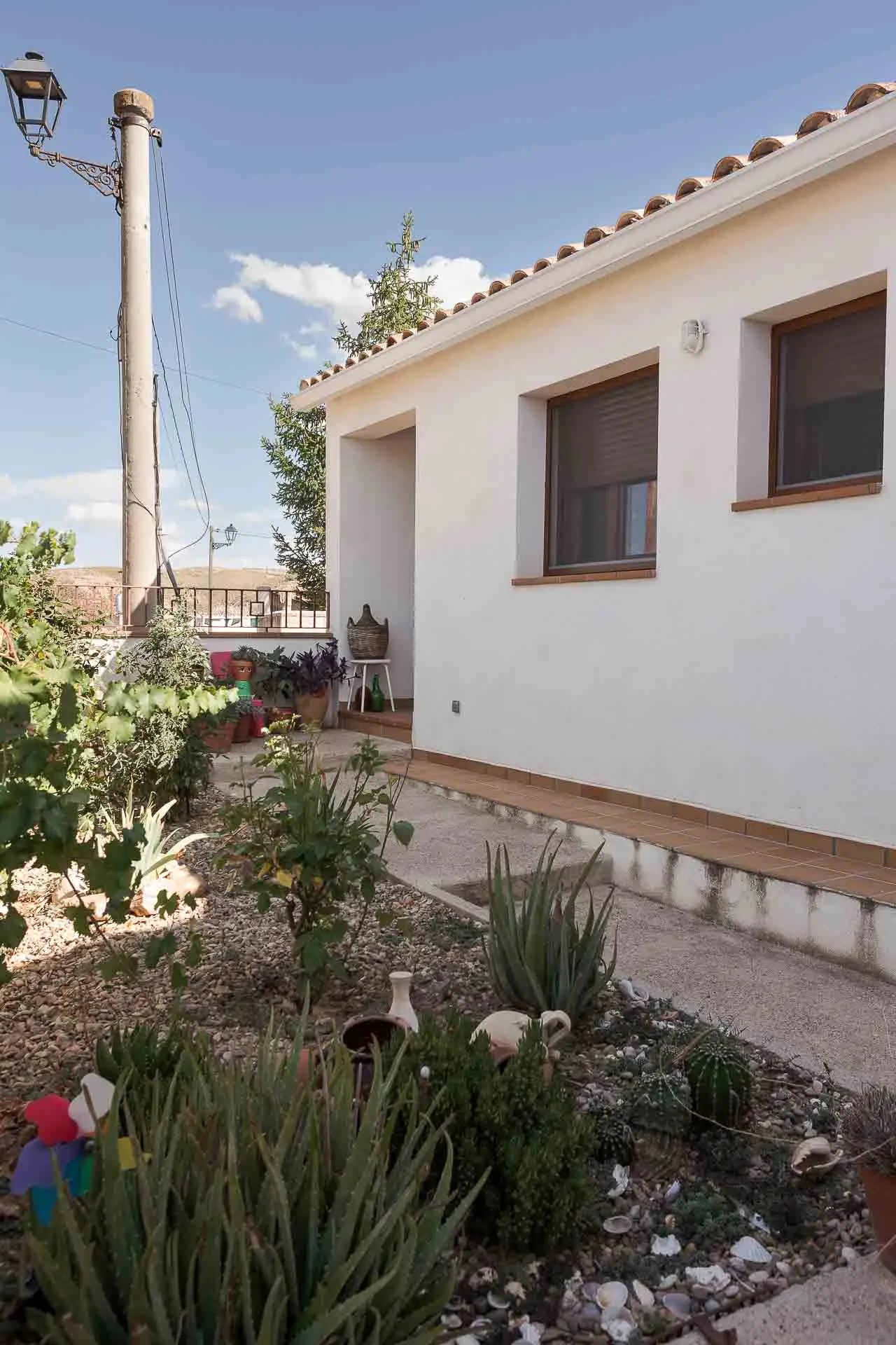 La casa tiene un acceso a doble nivel en la alineación con la calle, con un pequeño jardín de piedras, y siempre con una vista destacada sobre el pueblo.