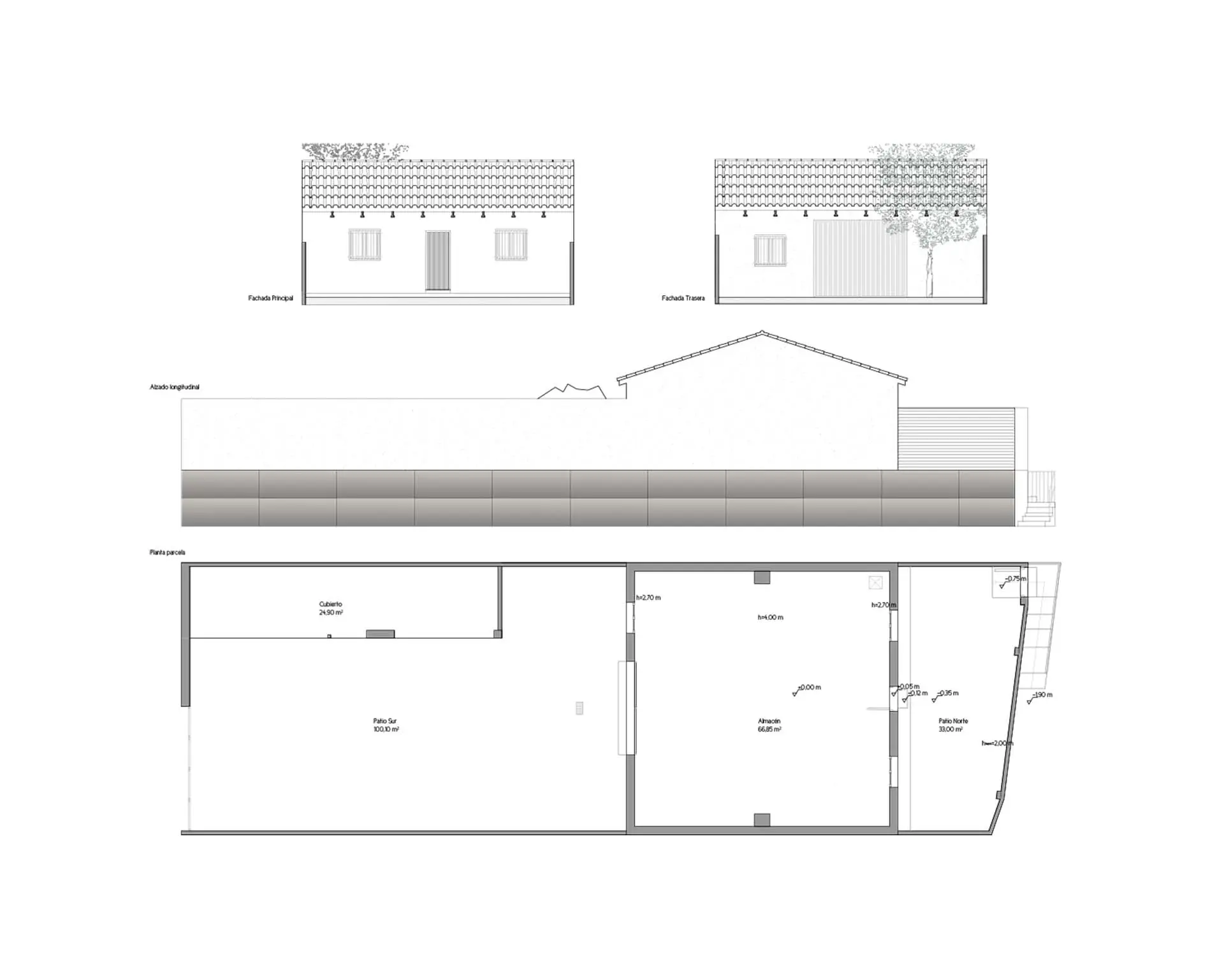 El patio sur da un acceso secundario a nivel a calle trasera. En este patio se edifican construcciones auxiliares de almacén e instalaciones. Este patio queda recogido entre los muros medianeros de las parcelas adyacentes.