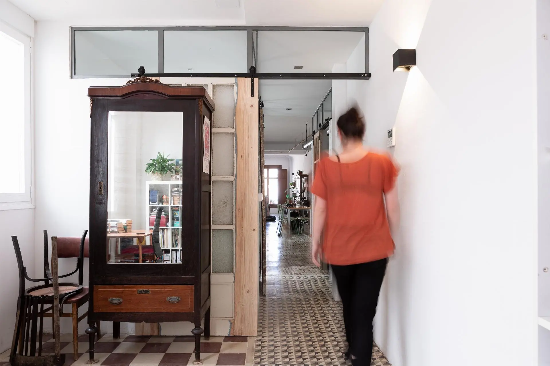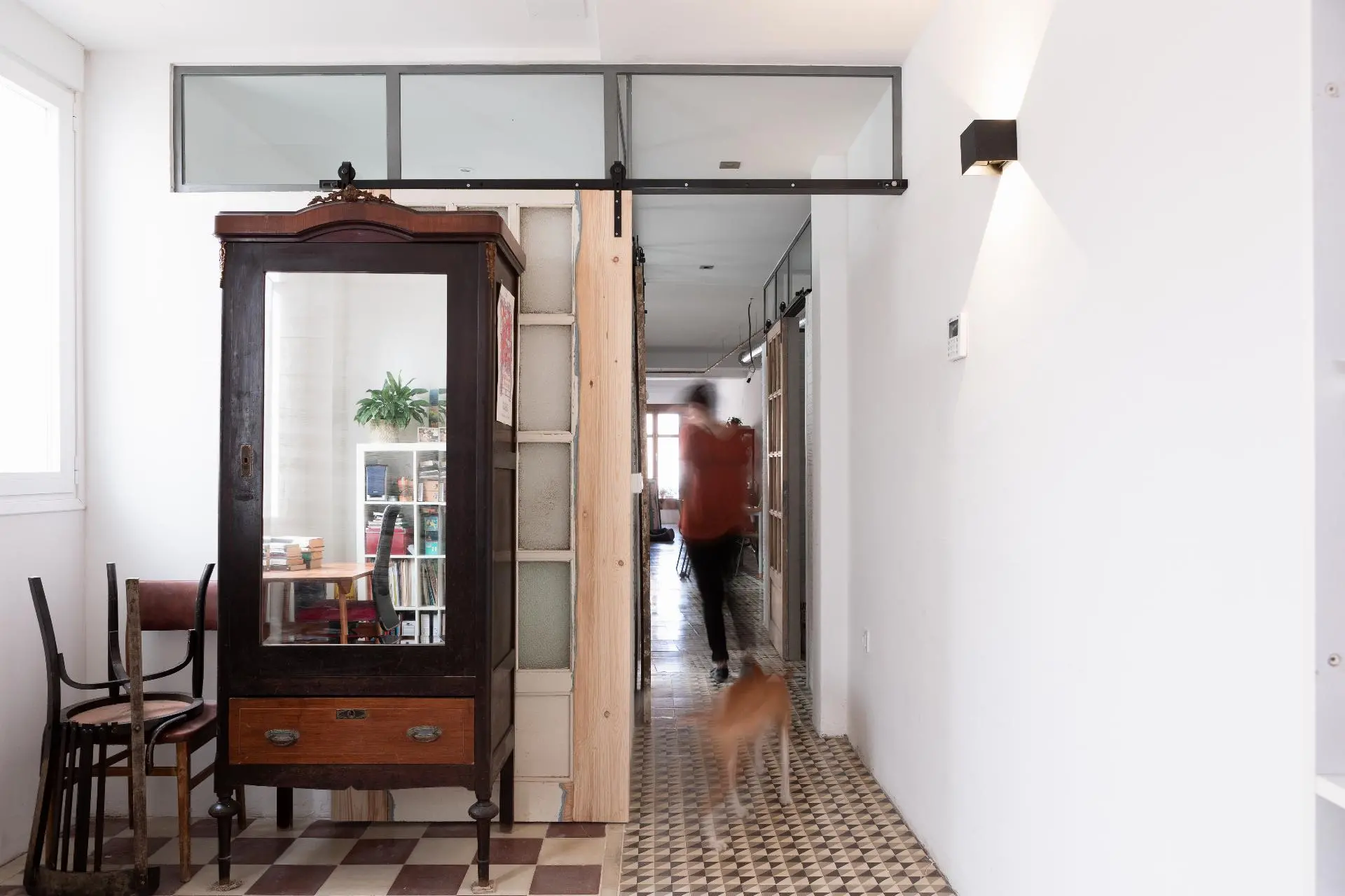 - Debido a la forma alargada de la vivienda se mantuvieron en las zonas superiores de los tabiques de cocina y baños unas cristaleras de hierro y vidrio que permiten siempre el paso de luz natural hacia las zonas menos iluminadas (montantes).