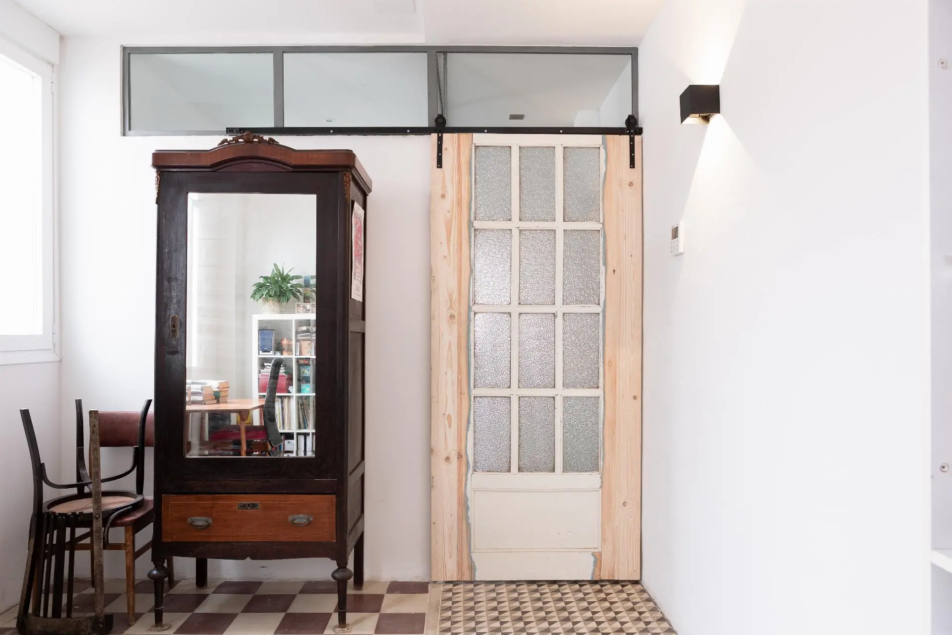 - Puertas recuperadas de madera, en un caso recrecida con tablero macizo de pino aceitado natural y montadas sobre guías correderas metálicas de estilo industrial.